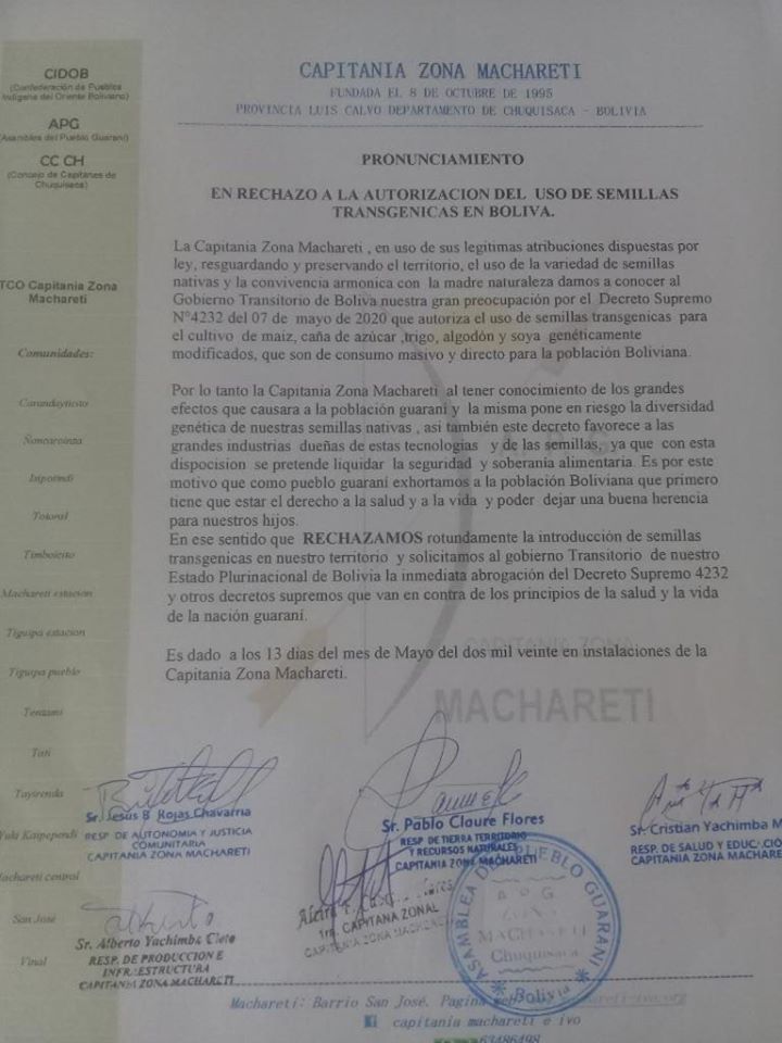 En el marco de la Feria Agro-productiva, artesanal y cultural, Macharetí (2019) se contó con la visita de Macharety del Paraguay de la Comunidad de Laguna Negra Chaco. Pedro Román Bordón, líder de la Comunidad; Gloria Flores, feriante y enfermera; y Guadalupe Rojas, feriante y representante de los jóvenes han compartido sus experiencias sobre gestión y acceso a tierra, agua y mercados. Esta delegación también visitó las comunidades de Tentamí e Isipotindi junto a una compañera de Colombia, representante de la ACIN. Los efectos de esta visita han marcado la importancia de la autonomía y el tema de la educación bilingüe bajo el control de la organización. Se recupera del caso boliviano el fortalecimiento organizativo y del caso paraguayo el trabajo con la cosecha de agua.